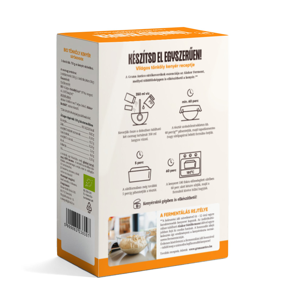 • Indítókultúra: Alakor Ferment Koncentrátum (tejsavbaktérium által fermentált teljes őrlésű Alakor liszt*), száraz élesztő
